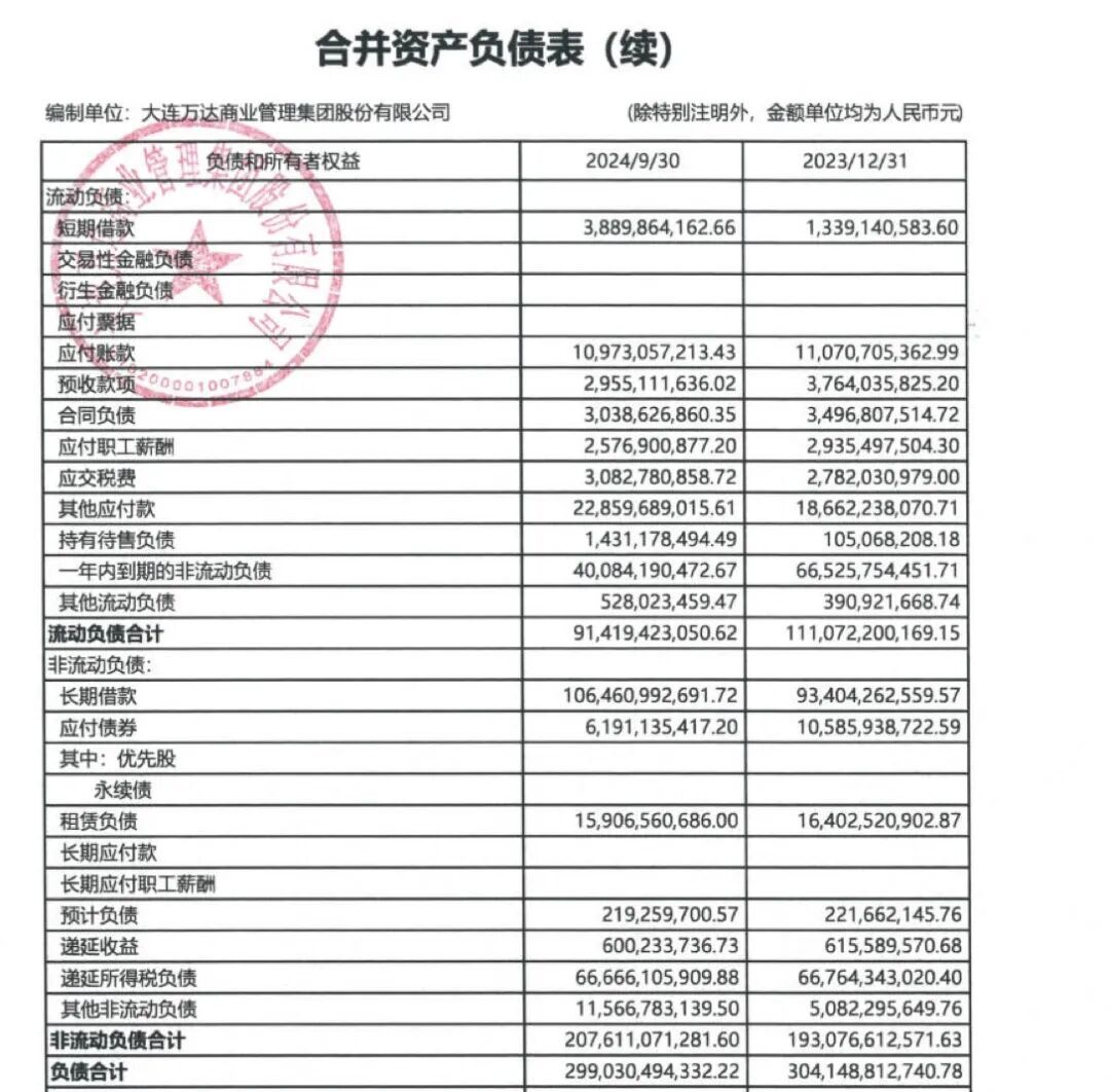 合并资产负债表/图源:大连万达商管2024年三季度的财报