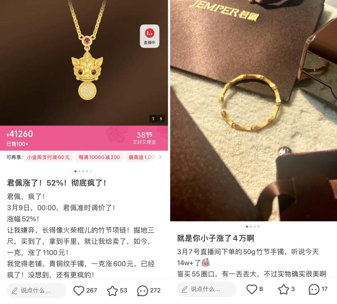2026年1月底至3月初,“四姐妹”相继完成调价动作,君佩公布3月9日调价后同样迎疯抢,一只50克的竹节手镯在调价落地后售价超14万,涨了近5万。