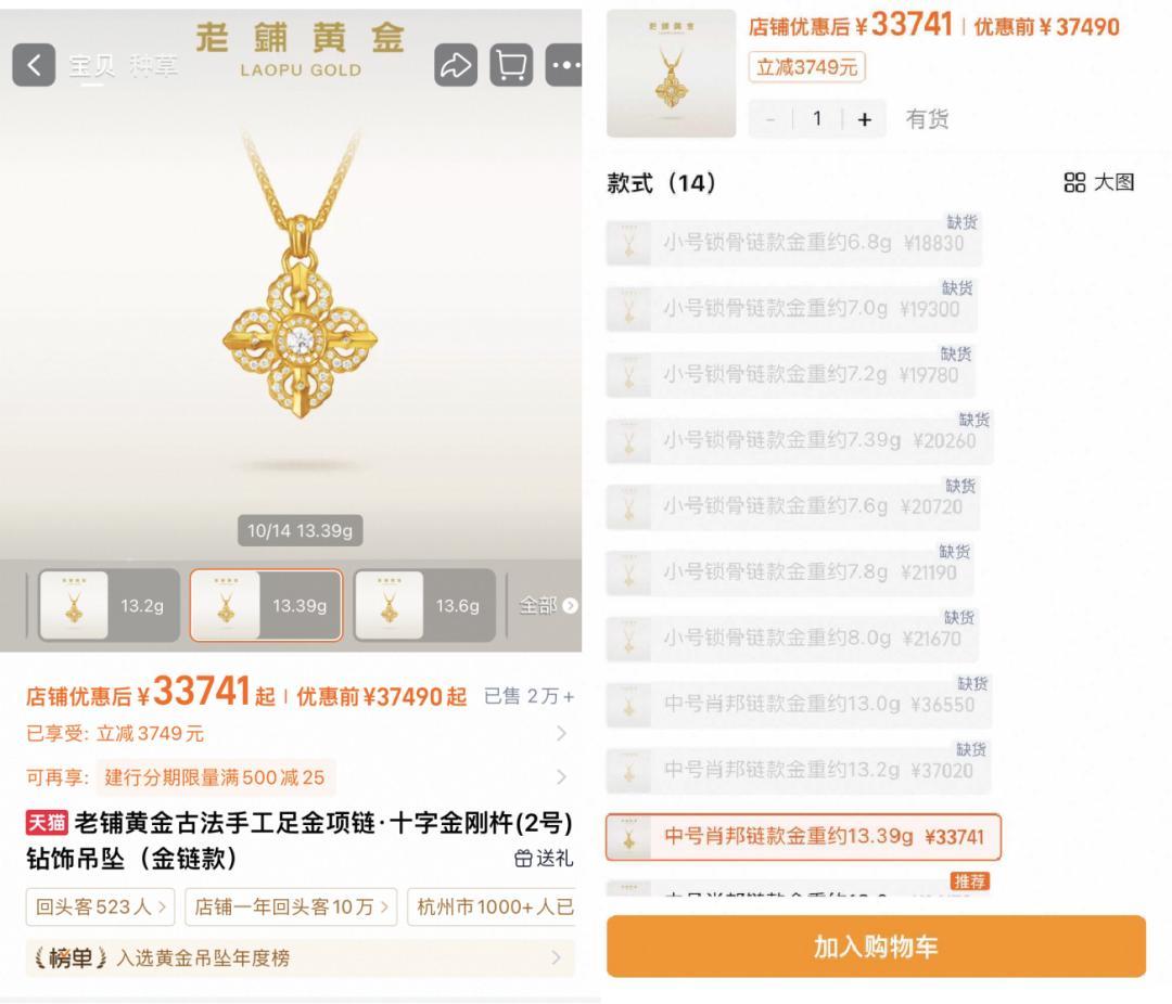 《天下网商》发现,2月调价后,老铺的热门款克价突破2000元,比如一款13.39克的十字金刚杵吊坠涨至33741元,折合克价2520元;而同期,周大福、周生生等黄金品牌的一口价产品克价多在1500元左右。