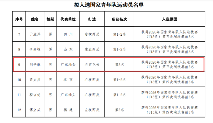 大皖新闻讯 1月21日至26日,由中国乒协主办的“2026年国家青年队入队选拔赛(U15组)”在河北正定国家乒乓球训练基地顺利结束。通过“首轮海选+多轮淘汰赛”的竞赛方式,经过6天共881场比赛的激烈比拼,最终共有12名男运动员和9名女运动员脱颖而出,获得国家青年队的入队资格。其中,安徽籍乒乓小将刘子航以第三次淘汰赛第3名的成绩成功入选国家青年男队。
